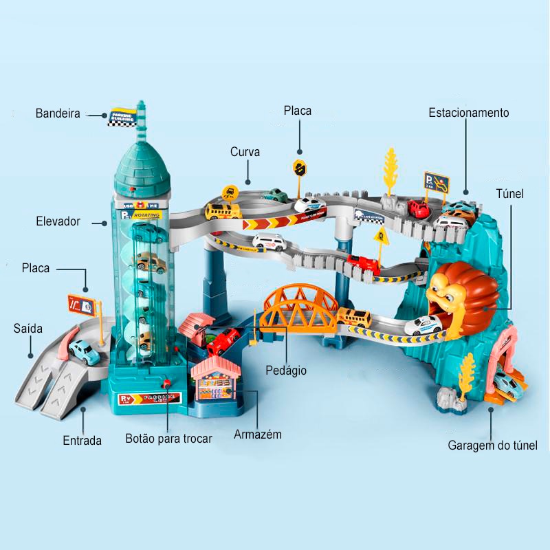 Os carrinhos sobem no elevador e descem até a superfície atravessando diversos obstáculos! Toda a pista vem desmontada, é necessário montá-la seguindo o manual de instruções incluso no pacote e logo após a montagem, conecte as pilhas AAA na parte inferior do elevador e estará pronta!
