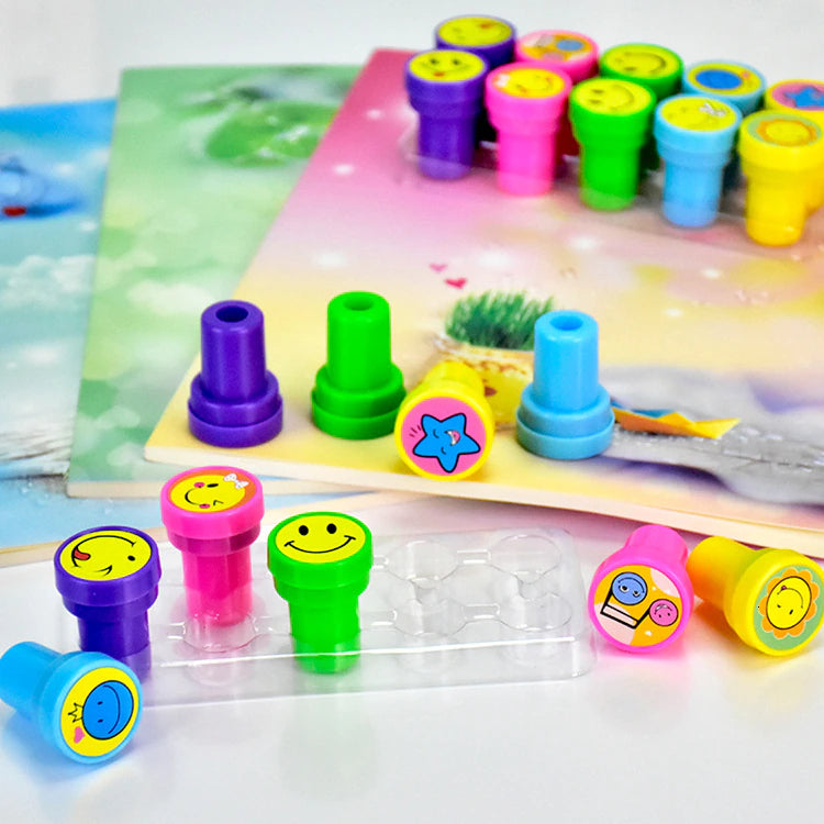 O Kit Carimbos Divertidos é ideal para quem quer deixar suas anotações mais divertidas e coloridas. Ele tem reservatório interno de tinta. A tinta é lavável e não é tóxica.